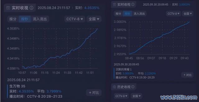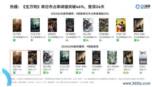 台网双爆成为了显耀亮点之一。如《生万物》以 4.3535% 的及时收视率峰值,突破央视八套近三年收视峰值记载,其网罗端市占率峰值也达到了 46.1%,创 2025 年新高。《千里默的荣耀》不仅在爱奇艺站内热度破 8500、置身"佳片殿堂",更成为央视八套本年最快破 3 的剧集,得益全网热搜 670+。